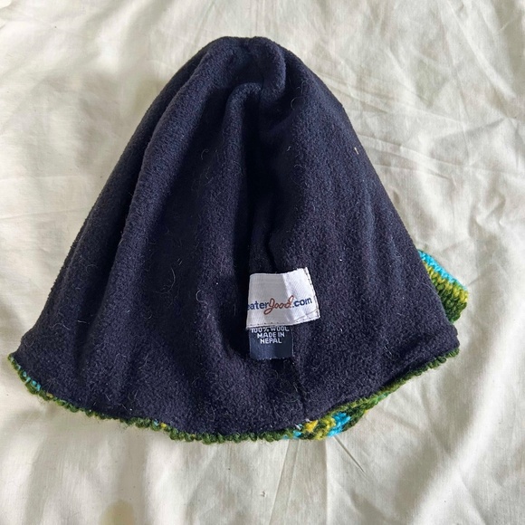 HAT, KNITTED 100% WOOL, MADE IN NEPAL, GREENS, LABEL "GREATER GOOD", ONE SIZE, DOUBLED FABRIC, HAS CHIN STRAP, IS LINED, COLLECTIBLE ITEM NOT AVAILABLE NOW, NEW, NEVER WORN
