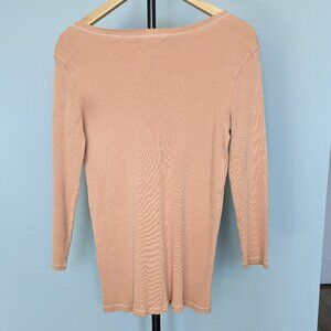 This rib knit 100% cotton Hatch maternity top has intentionally distressed hems, 3/4 sleeves and a wide scoop neck. In Hatch Size 1, that's equivalent to a small. This garment has a good amount of stretch based on the rib knit fabric.