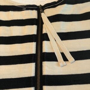 HATLEY black/cream striped tee with 3/4 length sleeves and back zipper with pull tabs. Slightly scooped hem at hip length which makes it easy to wear with jeans or leggings. Great for lounging, travelling or a night with friends! Washable.