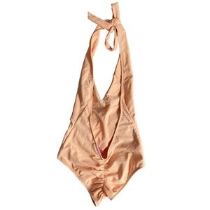 Have Faith orange one piece swimwear. Plunging halter v-neck with adjustable straps. Low back with ruching detailing on the bottom. Chic and sexy one piece that can be paired with shorts.
