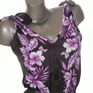 Stunning & Beautiful - Black with Purple floral Hawaiian Summer dress. Elastic waist, tie shoulders can be adjusted for fit. Excellent Condition.