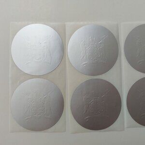 Lot of eight 2.5" silver stickers with the Hudson's Bay crest and motto.