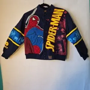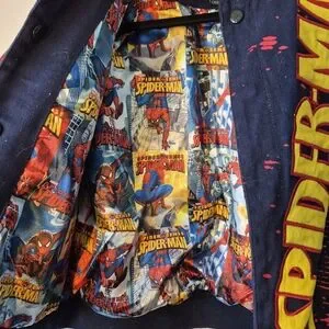 Vibrant Spider-Man graphic jacket with bold colors. Features iconic Spider-Man design and lettering.