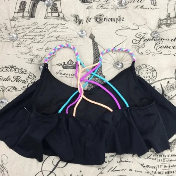 Colorful knotted straps add cheerful personality to a two-piece swimsuit made with recycled fibers for eco-conscious appeal.