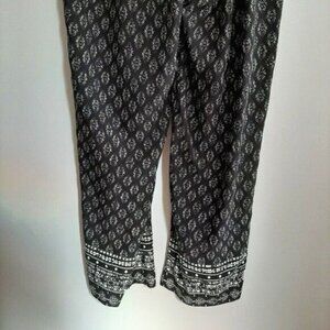• Sleeveless one piece scoop neck cropped jumpsuit in black, white and grey with elasticized waist.