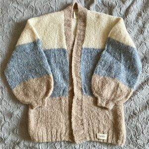 Featuring a chic blend of cream, blue, and tan, this sweater is perfect for any casual outing. Enjoy the soft, comfortable fit and timeless design. Oversized fit, open front, bell sleeves.