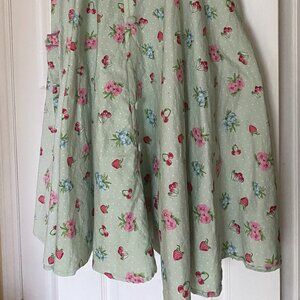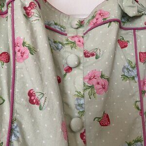 98% cotton, 2% spandex; fabric is soft green background with flowers and fruit