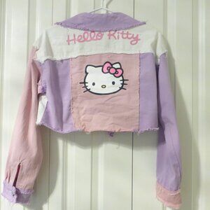 Collaboration between Hello Kitty Sanrio and Shein! Super cute colour block pastel denim jacket with frayed edges! In very good condition! Hello Kitty print and image on the back, front has two pockets, buttons up in the front, single button on each sleeve.