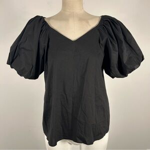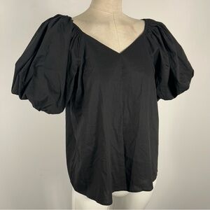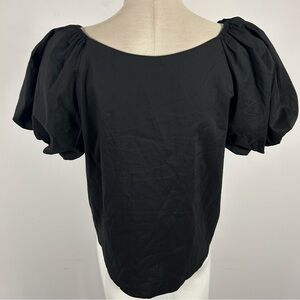 This elegant black top features stylish puff sleeves, perfect for any occasion. Its classic design offers a chic and versatile look.