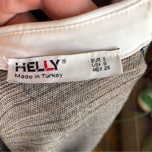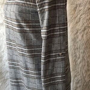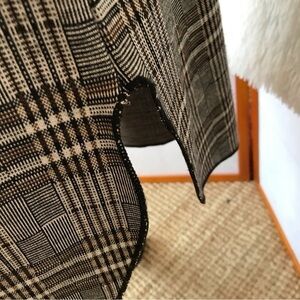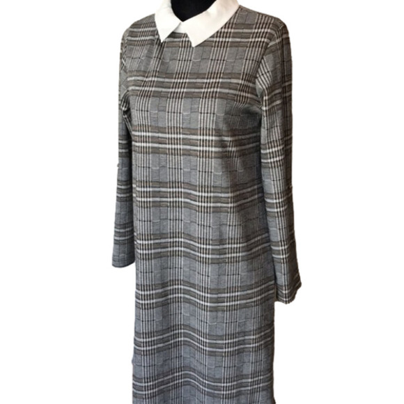 Gorgeous dress in classic plaid, neutral colours. Peter Pan collar, raw edge seam at bottom hem, keyhole back closure. Stretchy and flattering. See pics for measurements.