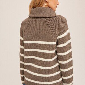 striped quarter zip sweater, cozy knit pullover, brown and white striped top, casual fall sweater, winter layering knit, boutique stripe pullover, neutral striped knitwear, relaxed fit sweater, quarter zip high collar sweater, everyday casual chic