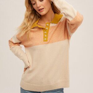 Colorblock Collared Sweater with Button Placket, Mustard Peach Cream Pullover