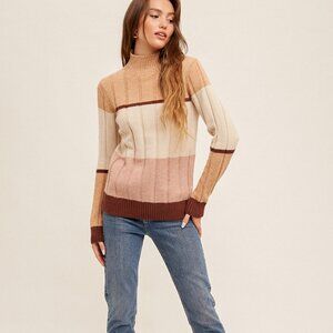 Colorblock Mock Neck Sweater, Neutral Blush Tan Cream, Cozy Knit Pullover Fall Winter Trendy