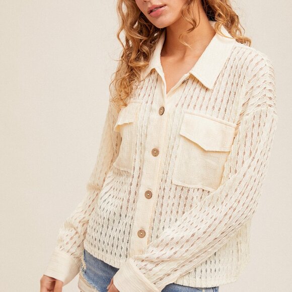 HEM & THREAD Cream Textured Sheer Button-Up Top, Lightweight Shacket Blouse