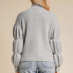 grey balloon sleeve sweater, mock neck pullover, ribbed knit top, cozy fall sweater, statement sleeve knitwear, puff sleeve sweater, minimalist chic sweater, neutral color pullover, trendy winter sweater, soft warm knit top, elegant balloon sleeve knit