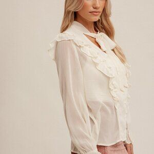 HEM & THREAD Ivory Ruffle Tie Blouse | Sheer Long Sleeve Feminine Top