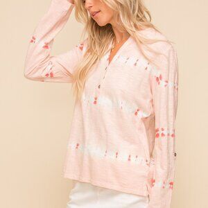 pink tie-dye top, blush henley shirt, long sleeve casual blouse, boho top, slub cotton shirt, pastel tie-dye, lightweight top, weekend style, resort wear, relaxed fit shirt, comfy soft tee, casual pink top, feminine loungewear