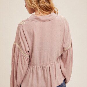 Mauve Swiss Dot Lace Trim Blouse, Boho Peasant Top with Tie Front & Long Sleeves