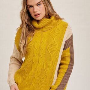 mustard yellow sweater, colorblock knit pullover, chunky turtleneck sweater, cozy oversized knit, fall winter fashion sweater, cable knit turtleneck, boutique colorblock sweater, trendy statement sweater, warm winter pullover, neutral and mustard knit top