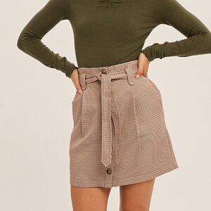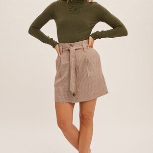 HEM & THREAD Taupe Plaid Belted Mini Skirt, High Waist Button-Front Skirt