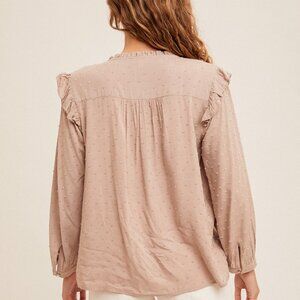 taupe blouse, swiss dot top, ruffle shoulder shirt, tie neck blouse, feminine boho top, fall neutral blouse, flowy top, romantic top, lightweight long sleeve blouse, classic chic top, boutique fashion