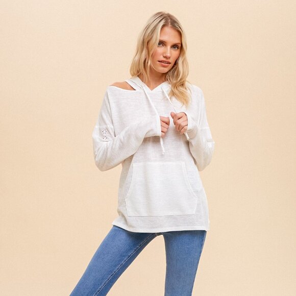 white cold shoulder hoodie, eyelet sleeve sweatshirt, boho lightweight pullover, feminine casual hoodie, boutique loungewear top, airy spring sweater, soft white knit hoodie, eyelet detail blouse, summer layering top, cozy boho chic outfit, relaxed neutral hoodie, embroidered sleeve sweatshirt