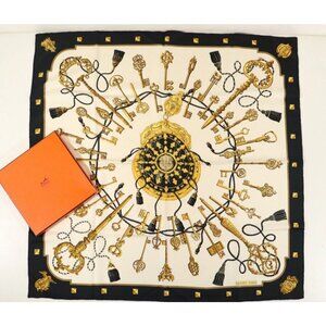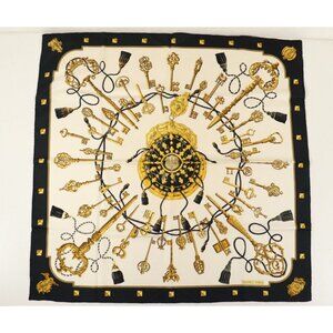 This is an authentic HERMES Silk Les Cles The Keys by Caty Latham Scarf 90. This stunning scarf is crafted of 100% silk and features a circular arrangement of antique keys, each one different from the next on a white background with black and gold.