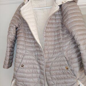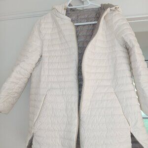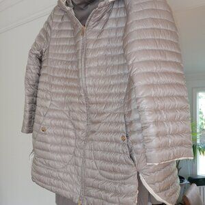Filled with ultra-fine goose down and crafted from silky-feel nylon = warmth without bulk.