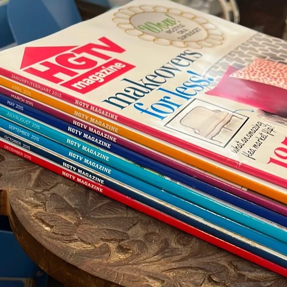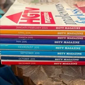 Collection of colorful HGTV magazines. Perfect for home inspiration. Full year subscription for 2015. (Some issues are bi monthly).