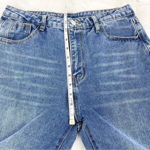 High waisted mom jeans from SHEIN Intentional fading and a rip at one knee (goes right through to the back of the pant leg). Denim is rigid. Size is "large", see measurements for fit.