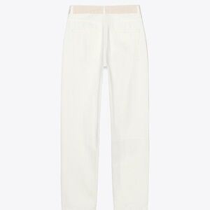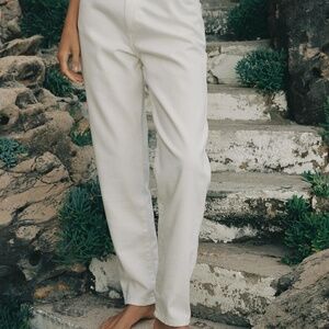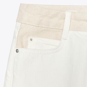 High-waisted jeans with a contrast waistband and five pockets. Front zip and button closure.