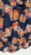 Fun Hawaiian shirt by Hilo Hattie The Hawaiian Original, is dark blue with Hawaiian themed patterns. Depicting scenes including a ukelele, a luau, tropical flowers. Fern leaf pattern in the blue background. Front pocket, side slits and coconut shell buttons.