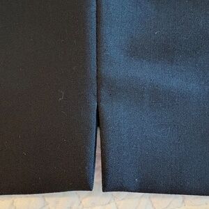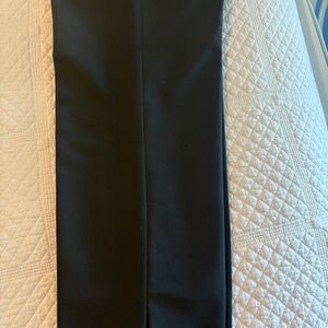 Black slacks with one back flat pocket, belt loops, tapered leg and slit hem.