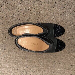 Black patent leather brogue style cap toe, suede, black leather and tweed wood .
