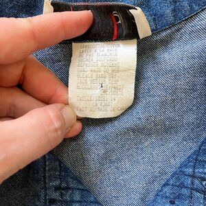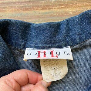Vintage HL Design denim chambray button up women's shirt has collared neckline and short sleeves. Colorful ribbon trim & fringe detail at the sleeve cuffs & hem of shirt. Metallic button closures. Has shoulder pads (could be removed). 100% cotton, care tag says "Hand Wash". Made in Canada. Tag size is women's "14", see below for garment measurements. Good pre-owned condition.