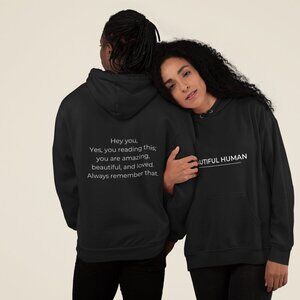 The back of this sweatshirt has a beautiful reminder for anyone behind you. It reads, 'Hey you, yes you reading this; you are amazing, beautiful and loved. Always remember that.'