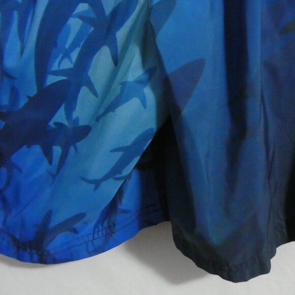 Stylish swim trunks featuring a shark themed design in varying shades of blue