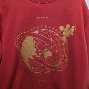 Red sweatshirt featuring a gold graphic design on the front.