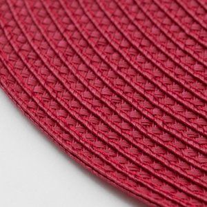Two round red placemats in braided faux straw.
