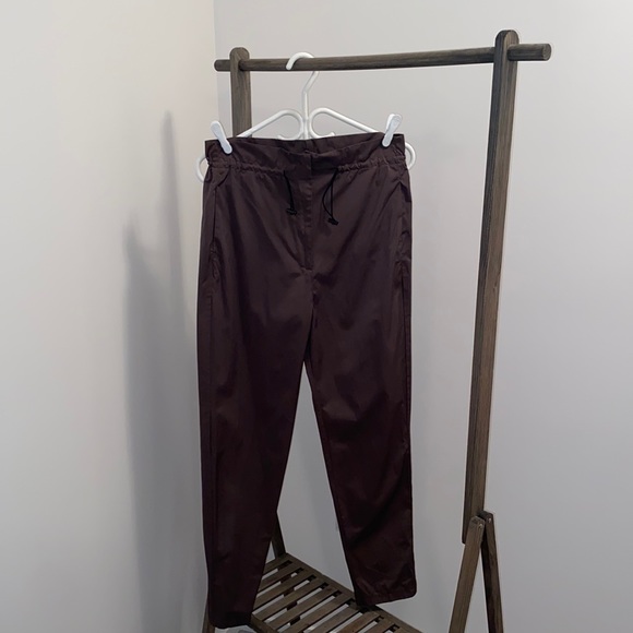 Fashion skinny pull on pant. Drawstring, one button with zipper closure. High waisted with side pockets. No stretch, gently used, in great condition!