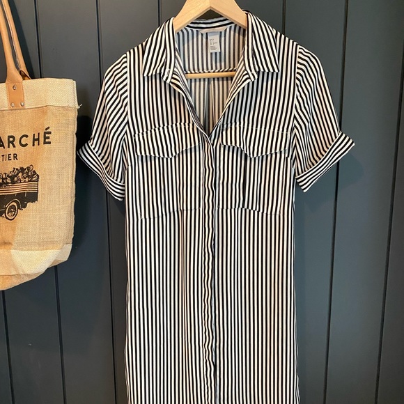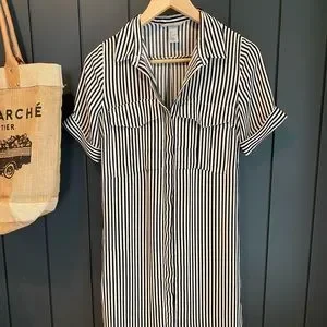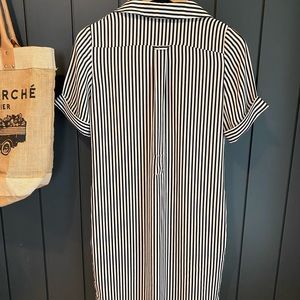 Black and white striped blouse dress. Buttons along entire front. Belt loop in the back if you would like to add one. Great shape, size 4!