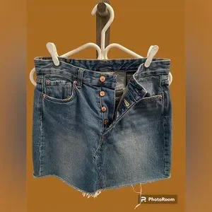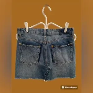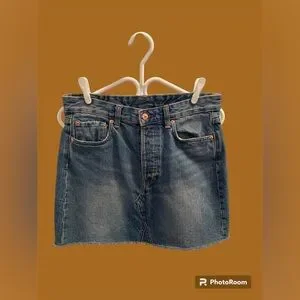 Fashion denim skirt. 5 pocket detailing with button fly closure. Raw hem finishing, back pockets has a darker blue colour beside pockets. No stretch, gently used, in good condition. Inseam measures 15.5”