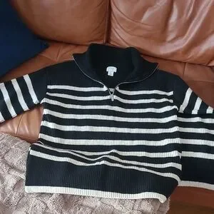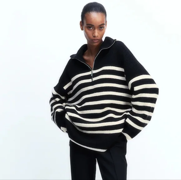 Relaxed-fit sweater in a soft rib knit with wool content. High collar, half-zip, heavily dropped shoulders, and long sleeves. Slightly angled slit at sides of hem.
