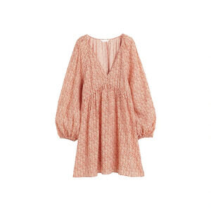 Short, A-line dress in airy, woven fabric. Low-cut V-neck, gathered seam at waist, and long, raglan-cut balloon sleeves with elasticized cuffs. Unlined.