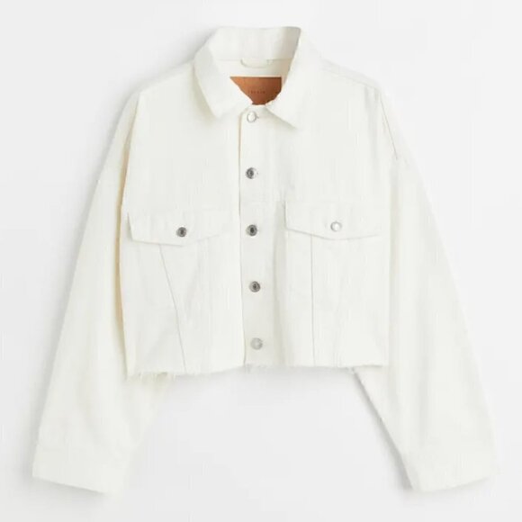 Short, boxy jacket in thick cotton denim. Collar, buttons at front, and chest pockets with flap and button. Heavily dropped shoulders, long, wide sleeves with button at cuffs, and cut-off, raw-edge hem.