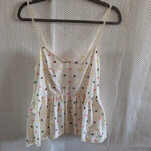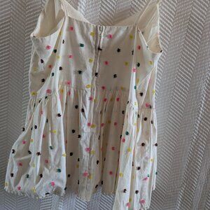 Add a touch of whimsical charm to your wardrobe with this H&M babydoll cami top. Crafted from a soft, lightweight cotton blend, it showcases playful textured polka dots in vibrant pink, yellow, green, and brownish/burgundy. The delicate embroidered hem adds a sweet, bohemian touch, while the peplum silhouette creates a lovely fit. Zips up the back for a sleek closure.
