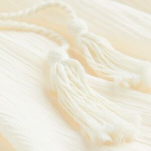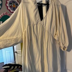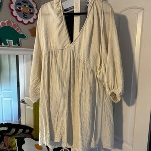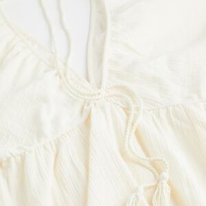 Short dress in woven cotton fabric. V-neck at front and back, horizontal ties at back of neck, and a gathered elasticized seam below bust. Voluminous. 3/4-length balloon sleeves and narrow, covered elastic at cuffs.