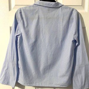 H&M blue and white bell-sleeved striped button up top; embroidered with "Never look back" on the left; worn once; excellent condition