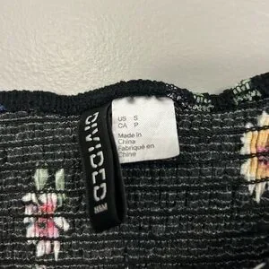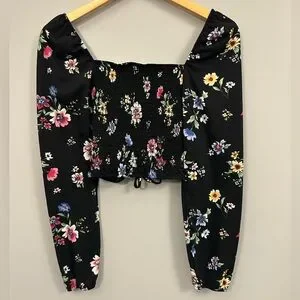 Chic black blouse with colorful floral design. Features long sleeves and ruched front. Ideal for stylish outings.