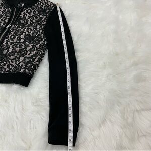 Cute bomber style jacket with black lace detail over a nude base. Can easily be dressed up or down for any occasion. Excellent condition, size small.